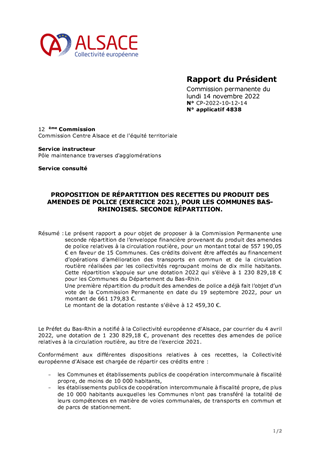 PROPOSITION DE RÉPARTITION DES RECETTES DU PRODUIT DES AMENDES DE POLICE (EXERCICE 2021), POUR LES COMMUNES BAS-RHINOISES. SECONDE RÉPARTITION.