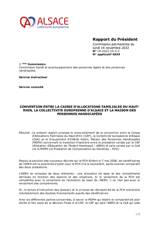 Le présent rapport propose le renouvellement de la convention entre la Caisse d’Allocations Familiales du Haut-Rhin (CAF), la Collectivité européenne d’Alsace (CeA) et le Groupement d’Intérêt Public, Maison des Personnes Handicapées (MDPH) concernant la transition financière entre la prestation versée par la CAF (Allocation d’Education de l’Enfant Handicapé - AEEH) et celle versée par la CeA via la MDPH (la Prestation de Compensation du Handicap - PCH).