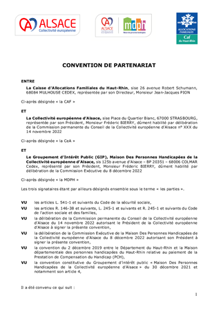 CONVENTION ENTRE LA CAISSE D'ALLOCATIONS FAMILIALES DU HAUT-RHIN, LA COLLECTIVITE EUROPEENNE D'ALSACE ET LA MAISON DES PERSONNES HANDICAPÉES