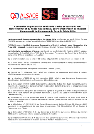 Le présent rapport a pour objet de proposer à la Commission permanente du Conseil de la Collectivité européenne d’Alsace d’approuver l’extension du dispositif d’aide volontariste de la Collectivité européenne d’Alsace « Fonds Alsace Rénov » à la Communauté de communes du Pays de Sainte Odile, au travers d'une convention de partenariat. Ce dispositif volontariste vient en appui des Programmes d’Intérêt Général déployés sur l’ensemble du territoire alsacien, hors Eurométropole de Strasbourg, et Mulhouse Alsace Agglomération. Ces dernières sont régies par des conventions bilatérales spécifiques. Le Fonds Alsace Rénov’ (délibération n° CD-2021-8-4-2 du Conseil de la Collectivité européenne d’Alsace du 6 décembre 2021) permet d’apporter des aides financières au titre de la politique volontariste de la Collectivité européenne d'Alsace, pour les opérations de rénovation du parc privé. Ces aides interviennent en complément des aides de l’Anah et des collectivités partenaires attribuées au titre des dispositifs programmés.