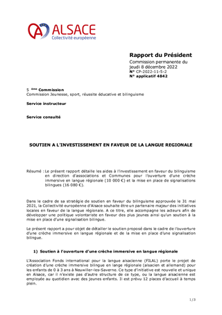 Le présent rapport détaille les aides à l'investissement en faveur du bilinguisme en direction d'associations et Communes pour l’ouverture d'une crèche immersive en langue régionale (10 000 €) et la mise en place de signalisations bilingues (16 080 €).