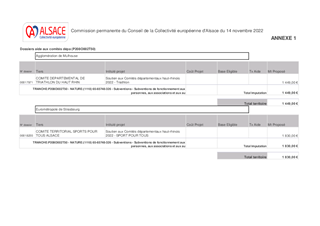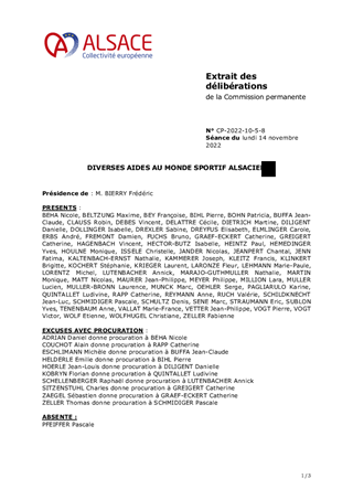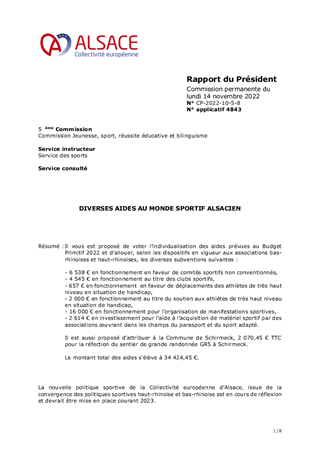 Il vous est proposé de voter l’individualisation des aides prévues au Budget Primitif 2022 et d’allouer, selon les dispositifs en vigueur aux associations bas-rhinoises et haut-rhinoises, les diverses subventions suivantes : - 6 538 € en fonctionnement en faveur de comités sportifs non conventionnés, - 4 545 € en fonctionnement au titre des clubs sportifs, - 657 € en fonctionnement en faveur de déplacements des athlètes de très haut niveau en situation de handicap, - 2 000 € en fonctionnement au titre du soutien aux athlètes de très haut niveau en situation de handicap, - 16 000 € en fonctionnement pour l’organisation de manifestations sportives, - 2 614 € en investissement pour l'aide à l’acquisition de matériel sportif par des associations œuvrant dans les champs du parasport et du sport adapté. Il est aussi proposé d'attribuer à la Commune de Schirmeck, 2 070,45 € TTC pour la réfection du sentier de grande randonnée GR5 à Schirmeck. Le montant total des aides s'élève à 34 424,45 €.