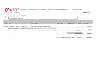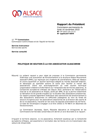 Le présent rapport a pour objet de proposer à la Commission permanente d’attribuer une subvention de fonctionnement à la structure Alsace Mouvement associatif (AMA), qui regroupe une vingtaine de coordinations, têtes de réseaux et unions apportant un soutien technique adapté au monde associatif alsacien, et développe au quotidien actions et outils pour faciliter le travail des associations. Outre son accompagnement au volet soutien technique (organisation d’ateliers d’information sur l’ensemble des territoires alsaciens), la Collectivité européenne d’Alsace est depuis 2021 partenaire de l’Observatoire local de la vie associative en Alsace, porté par AMA, et qui a permis notamment la réalisation d’une grande enquête sur la situation des associations alsaciennes. Ce rapport propose également d’attribuer des subventions de fonctionnement à des associations alsaciennes en difficultés passagères au titre du fonds de secours d’urgence pour les associations alsaciennes de la direction des sports et de la vie associative, travaillé en lien avec les équipes d’animation du territoire. Le total de l’enveloppe à engager à ce titre s’élève à 70 900 € en dépenses de fonctionnement. La Commission Jeunesse, Sport, Réussite éducative et bilinguisme et les Commissions territoriales concernées ont donné un avis favorable à ce rapport.