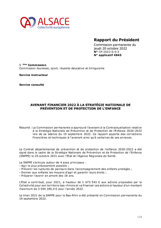 La Commission permanente a approuvé l'avenant à la Contractualisation relative à la Stratégie Nationale de Prévention et de Protection de l’Enfance 2020-2022 lors de sa séance du 19 septembre 2022. Ce rapport apporte des corrections financières et techniques à l'avenant ainsi qu'à certaines de ses annexes.