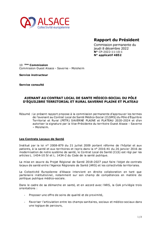 Le présent rapport propose à la commission permanente d’approuver les termes de l’avenant au Contrat Local de Santé Médico-Social (CLSMS) du Pôle d’Equilibre Territorial et Rural (PETR) SAVERNE PLAINE et PLATEAU 2020-2024 et d’en autoriser la signature par la Vice-Présidente du territoire Ouest Alsace - Saverne – Molsheim.