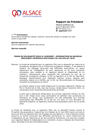 Le Fonds de Solidarité pour le Logement (FSL) est un dispositif qui relève de la compétence obligatoire de la Collectivité européenne d’Alsace. Il est destiné à soutenir les ménages éprouvant des difficultés particulières, en raison notamment de l'inadaptation de leurs ressources ou de leurs conditions d'existence, pour accéder à un logement décent et indépendant et s'y maintenir. Actuellement, deux dispositifs FSL coexistent au sein de la Collectivité européenne d’Alsace, le FSL du Bas-Rhin et le FSL du Haut-Rhin, disposant respectivement d'un règlement intérieur propre, lesquels sont complétés, depuis la loi NoTRe, par le FSL de l'Eurométropole de Strasbourg (transfert de compétence en 2017). Le présent rapport a pour objet d’approuver le nouveau règlement intérieur du FSL à l'échelle de la CeA, issu des travaux menés depuis l'automne 2021, en concertation avec l'ensemble des partenaires du Fonds. A noter que la démarche d’élaboration du nouveau règlement intérieur du FSL CeA a fait l'objet d'une large participation et adhésion des partenaires et financeurs du Fonds. Ces propositions ont été présentées aux Comités responsables des PDALHPD 67 et 68 qui ont émis un avis favorable au document présenté. Le règlement intérieur sera applicable à partir du 1er juillet 2023.