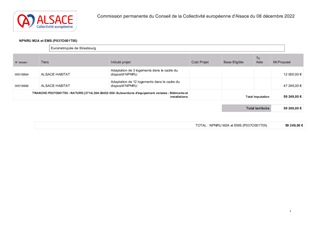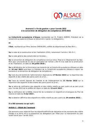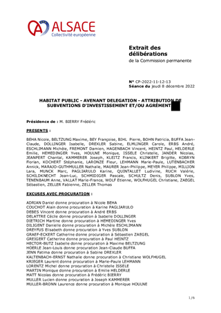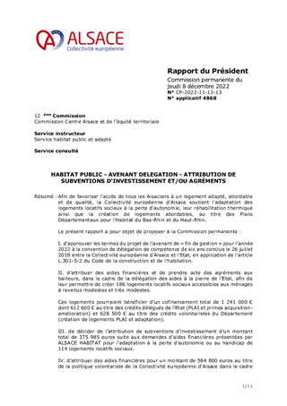 Afin de favoriser l'accès de tous les Alsaciens à un logement adapté, abordable et de qualité, la Collectivité européenne d'Alsace soutient l'adaptation des logements locatifs sociaux à la perte d'autonomie, leur réhabilitation thermique ainsi que la création de logements abordables, au titre des Plans Départementaux pour l'Habitat du Bas-Rhin et du Haut-Rhin. Le présent rapport a pour objet de proposer à la Commission permanente : I. d’approuver les termes du projet de l’avenant de « fin de gestion » pour l’année 2022 à la convention de délégation de compétence de six ans conclue le 26 juillet 2018 entre la Collectivité européenne d'Alsace et l’Etat, en application de l’article L.301-5-2 du Code de la construction et de l’habitation. II. d’attribuer des aides financières et de prendre acte des agréments aux bailleurs, dans le cadre de la délégation des aides à la pierre de l’Etat, afin de leur permettre de créer 186 logements locatifs sociaux accessibles aux ménages à revenus modestes et très modestes. Ces logements pourraient bénéficier d’un cofinancement total de 1 241 000 € dont 612 600 € au titre des crédits délégués de l’Etat (PLAI et primes acquisition-amélioration) et 628 500 € au titre des crédits volontaristes du Département (création de logements PLAI et adaptation). III. de décider de l’attribution de subventions d’investissement d’un montant total de 375 985 euros suite aux demandes d’aides financières présentées par ALSACE HABITAT pour l'adaptation à la perte d'autonomie ou au handicap de 114 logements locatifs sociaux. IV. d’attribuer des aides financières pour un montant de 584 800 euros au titre de la politique volontariste de la Collectivité européenne d'Alsace dans le cadre de la convention de partenariat avec la Banque des territoires: - LE FOYER DE LA BASSE BRUCHE pour une opération de 63 logements à MOLSHEIM - NEOLIA pour une opération de 78 logements située à PFASTATT - SOMCO pour une opération de 20 logements située à MULHOUSE - POLE HABITAT COLMAR CENTRE ALSACE pour deux opérations de 74 logements situées à COLMAR - HABITATS DE HAUTE ALSACE pour une opération de 117 logements située à HUNINGUE