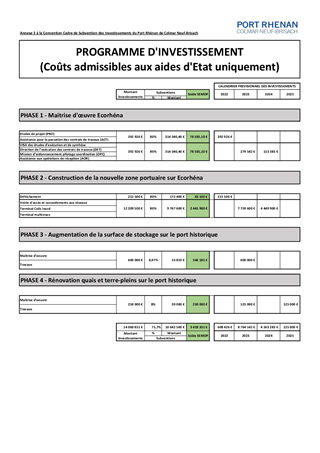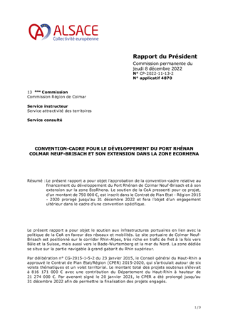 Le présent rapport a pour objet l'approbation de la convention-cadre relative au financement du développement du Port Rhénan de Colmar Neuf-Brisach et à son extension sur la zone EcoRhena. Le soutien de la CeA pressenti pour ce projet, d'un montant de 750 000 €, est inscrit dans le Contrat de Plan Etat - Région 2015 - 2020 prorogé jusqu'au 31 décembre 2022 et fera l'objet d'un engagement ultérieur dans le cadre d'une convention spécifique.