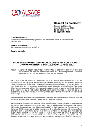Le présent rapport a pour objet de présenter, en application de la loi, le bilan des autorisations de création de services d'aide et d'accompagnement à domicile déposées en 2022 et des suites qui leur ont été données.