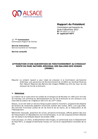Le présent rapport a pour objet de proposer à la Commission permanente d’attribuer une subvention de fonctionnement de 14 000 € au Syndicat Mixte du Parc Naturel Régional des Ballons des Vosges (PNRBV) au titre du loyer du site d’accueil du Col de la Schlucht.