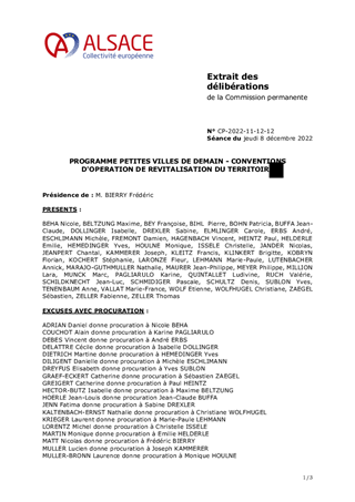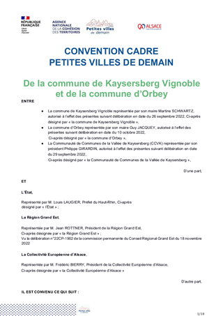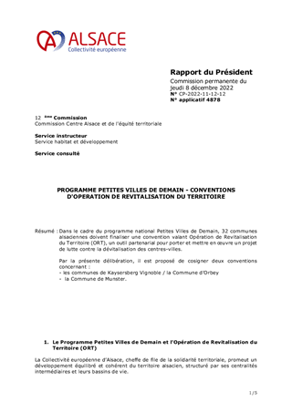 Dans le cadre du programme national Petites Villes de Demain, 32 communes alsaciennes doivent finaliser une convention valant Opération de Revitalisation du Territoire (ORT), un outil partenarial pour porter et mettre en œuvre un projet de lutte contre la dévitalisation des centres-villes. Par la présente délibération, il est proposé de cosigner deux conventions concernant : - les communes de Kaysersberg Vignoble / la Commune d’Orbey - la Commune de Munster.