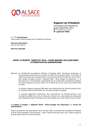 La Collectivité européenne d’Alsace s'implique dans l’aventure olympique et paralympique notamment au travers du label Terre de Jeux 2024. C'est dans le cadre de ce label qui permet de faire vivre les Jeux de Paris 2024 sur le territoire, que l'appel à projets intitulé « Objectif 2024 : Faire bouger les Alsaciens ! », a été voté par la Commission permanente de la Collectivité européenne d’Alsace lors de sa séance du 20 juin 2022 (n° CP-2022-6-12-16) pour les années 2022 et 2023. Le présent rapport propose d’attribuer des subventions de fonctionnement pour un montant total de 103 200 € au titre de cet appel à projets. Il propose également d’attribuer des subventions de fonctionnement d’un montant de 3660 € au titre de l’aide à la licence et la valorisation du bénévolat des associations bas-rhinoises et au titre d’aides aux clubs sportifs haut-rhinois.