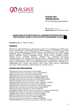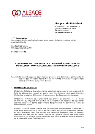 Le présent rapport a pour objet de proposer à la Commission permanente de décider des conditions d’attribution de l’indemnité forfaitaire de déplacement dans la Collectivité européenne d'Alsace.