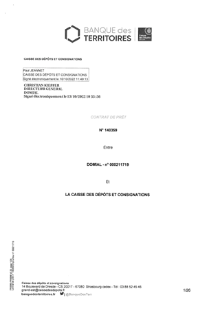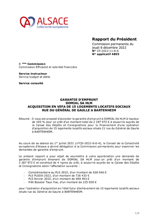 Il vous est proposé d’accorder la garantie d'emprunt à DOMIAL SA HLM à hauteur de 100 % pour un prêt d’un montant total de 2 287 972 € à souscrire auprès de la Caisse des Dépôts et Consignations pour le financement d'une opération d’acquisition de 15 logements locatifs sociaux situés 21 rue du Général de Gaulle à BARTENHEIM.