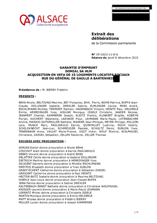 GARANTIE D'EMPRUNT DOMIAL SA HLM ACQUISITION EN VEFA DE 15 LOGEMENTS LOCATIFS SOCIAUX RUE DU GÉNÉRAL DE GAULLE A BARTENHEIM