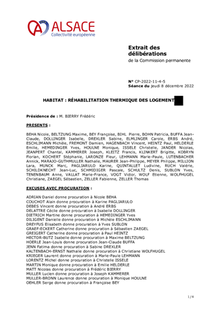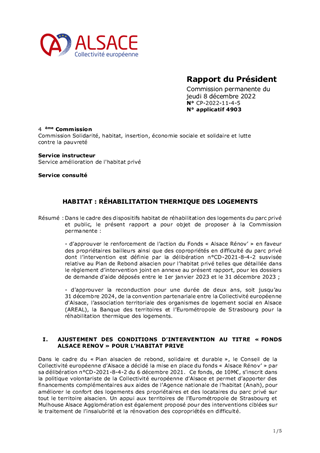 Dans le cadre des dispositifs habitat de réhabilitation des logements du parc privé et public, le présent rapport a pour objet de proposer à la Commission permanente : - d’approuver le renforcement de l’action du Fonds « Alsace Rénov’ » en faveur des propriétaires bailleurs ainsi que des copropriétés en difficulté du parc privé dont l’intervention est définie par la délibération n°CD-2021-8-4-2 susvisée relative au Plan de Rebond alsacien pour l’habitat privé telles que détaillée dans le règlement d’intervention joint en annexe au présent rapport, pour les dossiers de demande d’aide déposés entre le 1er janvier 2023 et le 31 décembre 2023 ; - d'approuver la reconduction pour une durée de deux ans, soit jusqu’au 31 décembre 2024, de la convention partenariale entre la Collectivité européenne d'Alsace, l’association territoriale des organismes de logement social en Alsace (AREAL), la Banque des territoires et l’Eurométropole de Strasbourg pour la réhabilitation thermique des logements.