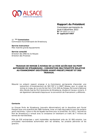 Le présent rapport propose à la Commission permanente d’accorder une subvention d'investissement de 565 997 € à SNCF Réseau pour le projet de remise à niveau de la voie ferrée fret n°141 000 du Réseau Ferroviaire National dite d'Accès Sud du Port Autonome de Strasbourg, études et travaux compris. Il est également demandé d’approuver la convention de financement y afférente.