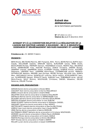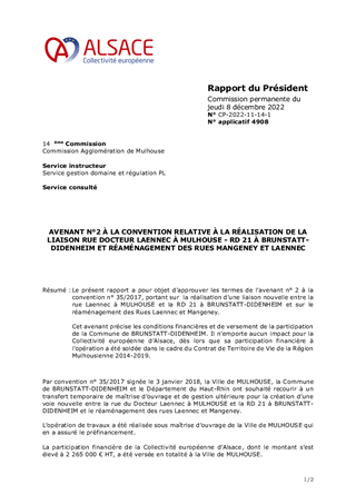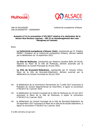 Le présent rapport a pour objet d’approuver les termes de l’avenant n° 2 à la convention n° 35/2017, portant sur la réalisation d’une liaison nouvelle entre la rue Laennec à MULHOUSE et la RD 21 à BRUNSTATT-DIDENHEIM et sur le réaménagement des Rues Laennec et Mangeney. Cet avenant précise les conditions financières et de versement de la participation de la Commune de BRUNSTATT-DIDENHEIM. Il n’emporte aucun impact pour la Collectivité européenne d’Alsace, dès lors que sa participation financière à l'opération a été soldée dans le cadre du Contrat de Territoire de Vie de la Région Mulhousienne 2014-2019.