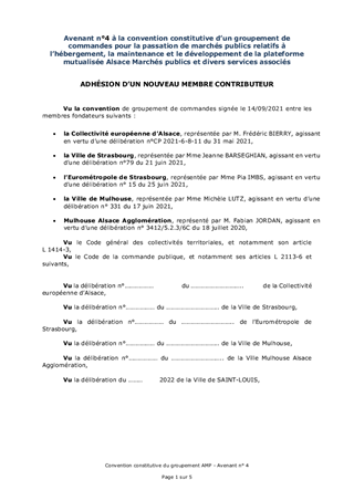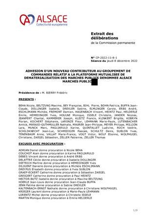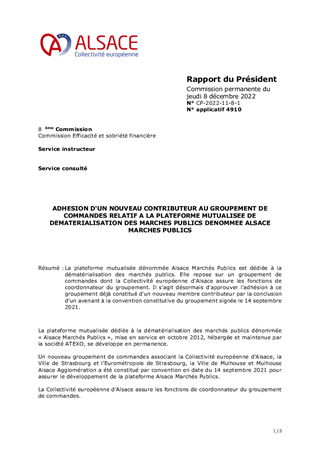La plateforme mutualisée dénommée Alsace Marchés Publics est dédiée à la dématérialisation des marchés publics. Elle repose sur un groupement de commandes dont la Collectivité européenne d'Alsace assure les fonctions de coordonnateur du groupement. Il s'agit désormais d'approuver l'adhésion à ce groupement déjà constitué d'un nouveau membre contributeur par la conclusion d'un avenant à la convention constitutive du groupement signée le 14 septembre 2021.