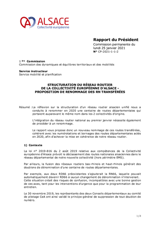La réflexion sur la structuration d’un réseau routier alsacien unifié nous a conduits à renommer en 2020 une centaine de routes départementales qui portaient auparavant le même nom dans les 2 collectivités d’origine. L’intégration du réseau routier national au premier janvier nécessite également de procéder à un renommage. Le rapport vous propose donc un nouveau nommage de ces routes transférées, cohérent avec les numérotations et bornages des routes départementales actés en 2020, afin d’achever la mise en cohérence de notre réseau routier.