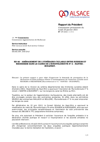 Le présent rapport a pour objet d’approuver la demande de prorogation de la déclaration d'utilité publique relative à l'aménagement de l'itinéraire cyclable entre RIXHEIM et RIEDISHEIM (l’Eurovéloroute n° 6 – NANTES – BUDAPEST).