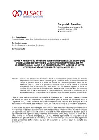APPEL À PROJETS DU FONDS DE SOLIDARITÉ POUR LE LOGEMENT (FSL) POUR LA MISE EN OEUVRE DE L'ACCOMPAGNEMENT SOCIAL LIÉ AU LOGEMENT (ASLL), L'AIDE À LA GESTION LOCATIVE (AGL) ET LA LUTTE CONTRE LA PRÉCARITÉ ÉNERGÉTIQUE - ANNÉE 2021