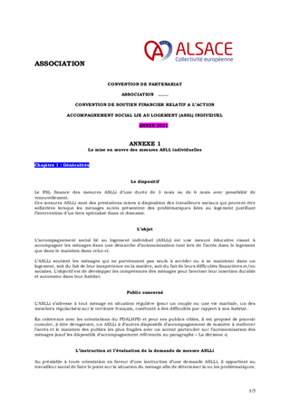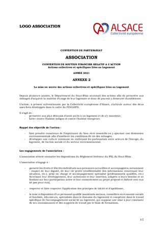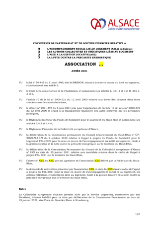 Lors de sa séance du 9 octobre 2020, la Commission permanente du Conseil départemental du Haut-Rhin a validé, pour l’exercice 2021, le renouvellement de l'appel à projets dédié à la mise en œuvre de l’accompagnement social lié au logement (ASLL), l’aide à la gestion locative (AGL) et la lutte contre la précarité énergétique sur le territoire du Haut-Rhin. Par le présent rapport, il vous est proposé d’attribuer les subventions aux associations retenues pour un montant total de 557 578 €, d’approuver la convention type y afférente et de m’autoriser à signer chacune des conventions particulières à intervenir avec lesdites associations.