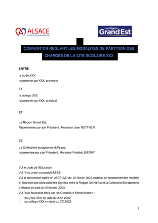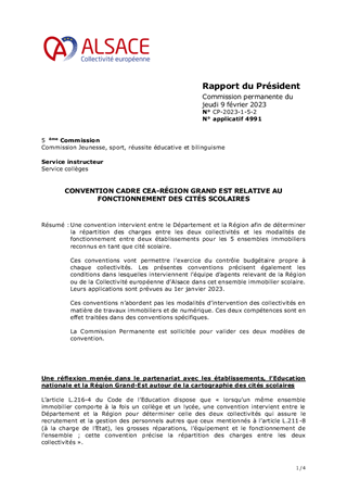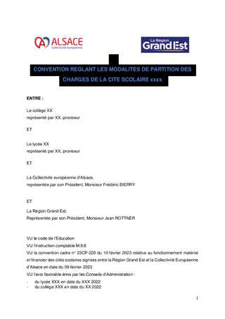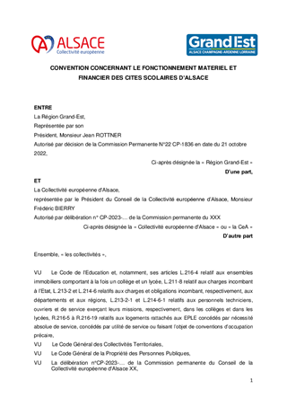 Une convention intervient entre le Département et la Région afin de déterminer la répartition des charges entre les deux collectivités et les modalités de fonctionnement entre deux établissements pour les 5 ensembles immobiliers reconnus en tant que cité scolaire. Ces conventions vont permettre l’exercice du contrôle budgétaire propre à chaque collectivités. Les présentes conventions précisent également les conditions dans lesquelles interviennent l’équipe d’agents relevant de la Région ou de la Collectivité européenne d’Alsace dans cet ensemble immobilier scolaire. Leurs applications sont prévues au 1er janvier 2023. Ces conventions n’abordent pas les modalités d’intervention des collectivités en matière de travaux immobiliers et de numérique. Ces deux compétences sont en effet traitées dans des conventions spécifiques. La Commission Permanente est sollicitée pour valider ces deux modèles de convention.