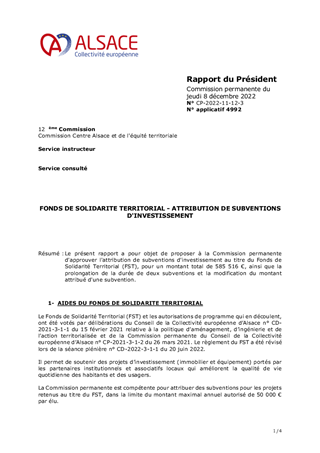 Le présent rapport a pour objet de proposer à la Commission permanente d'approuver l'attribution de subventions d'investissement au titre du Fonds de Solidarité Territorial (FST), pour un montant total de 585 516 €, ainsi que la prolongation de la durée de deux subventions et la modification du montant attribué d'une subvention.