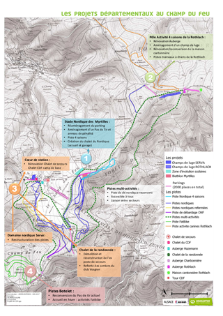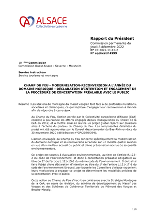 Les stations de montagne du massif vosgien font face à de profondes mutations, sociétales et climatiques, ce qui implique d’engager leur reconversion à l’année afin de répondre à ces enjeux. Au Champ du Feu, l’action portée par la Collectivité européenne d’Alsace (CeA) consiste à poursuivre les efforts engagés depuis l’inauguration du Chalet de la CeA en 2012, et à mettre ainsi en œuvre un projet global réparti sur plusieurs sites à l’échelle du plateau du Champ du Feu. Les composantes détaillées du projet ont été approuvées par le Conseil départemental du Bas-Rhin en date du 30 novembre 2020 (délibération n°CP/2020/394). L’action envisagée au Champ du Feu concerne spécifiquement la modernisation du domaine nordique et sa reconversion à l’année sur un modèle quatre saisons en vue d’un meilleur accueil du public et d’une préservation accrue de sa qualité environnementale. Ce projet est soumis à évaluation environnementale, au titre de l’article R.122-2 du code de l’environnement, et donc à concertation préalable obligatoire au titre du 2° de l’article L.121-15-1 du même code de l’environnement. Il doit ainsi faire l’objet d’une déclaration d’intention au titre du 1° de l’article L.121-17-1 du code de l’environnement là-aussi, par laquelle les Conseillers d’Alsace rappellent leurs motivations à engager ce projet et déterminent les modalités précises de la concertation avec le public. Cette action au Champ du Feu s’inscrit en cohérence avec la Stratégie Montagne de la CeA, en cours de révision, du schéma de développement du Massif des Vosges et des Schémas de Cohérence Territoriale du Piémont des Vosges et Bruche-Mossig.
