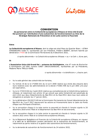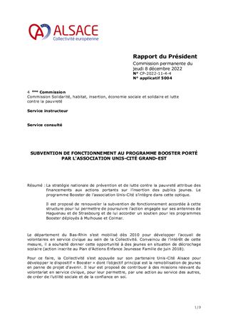 La stratégie nationale de prévention et de lutte contre la pauvreté attribue des financements aux actions portants sur l'insertion des publics jeunes. Le programme Booster de l'association Unis-Cité s’intègre dans cette optique. Il est proposé de renouveler la subvention de fonctionnement accordée à cette structure pour lui permettre de poursuivre l'action engagée sur ses antennes de Haguenau et de Strasbourg et de lui accorder un soutien pour les programmes Booster déployés à Mulhouse et Colmar.
