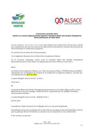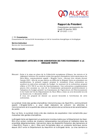 Suite à la mise en place de la Collectivité européenne d’Alsace, les statuts et le règlement intérieur du syndicat mixte des gardes-champêtres intercommunaux du Haut-Rhin, communément appelé « Brigade Verte » devront être révisés durant l’année 2021. Afin de ne pas mettre en difficulté la Brigade Verte en attendant ces modifications, le présent rapport propose le versement d’une subvention au syndicat en exécution anticipée du budget. Le montant de la subvention proposé s’élève à 573 785 € au titre du fonctionnement. Une subvention complémentaire pourra être soumise au vote de la Commission permanente postérieurement à l’adoption du budget primitif. La Commission de l'Agriculture, de l'Environnement et du Cadre de Vie du Département du Haut-Rhin a émis un avis favorable lors de sa réunion du 11 décembre 2020. Il vous est proposé de donner un accord favorable à l'attribution de cette subvention.