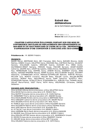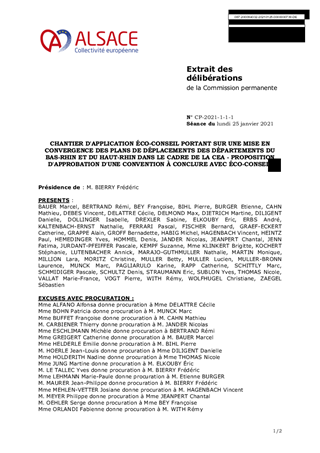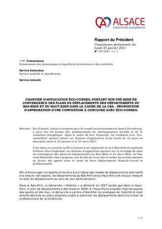 CHANTIER D'APPLICATION ÉCO-CONSEIL PORTANT SUR UNE MISE EN CONVERGENCE DES PLANS DE DÉPLACEMENTS DES DÉPARTEMENTS DU BAS-RHIN ET DU HAUT-RHIN DANS LE CADRE DE LA CEA - PROPOSITION D'APPROBATION D'UNE CONVENTION À CONCLURE AVEC ÉCO-CONSEIL