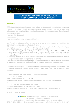 Éco-Conseil, institut européen pour le conseil en environnement basé à Strasbourg, a pour but de former des professionnels du développement durable et de la transition énergétique. Dans le cadre de leur formation, les étudiants dits "éco-conseillers" doivent mener un chantier d'application d'une durée de 23 jours se déroulant entre le 25 janvier et le 23 mars 2021. C'est dans ce contexte qu'Éco-Conseil s'est rapproché de la Collectivité européenne d'Alsace afin d'organiser un chantier d'application portant sur la stratégie de mise en convergence des plans de déplacements du Bas-Rhin et du Haut-Rhin. In fine, cette démarche vise à proposer une feuille de route afin d'unifier les actions menées en faveur des agents dans le cadre de leurs déplacements domicile-travail et professionnels.