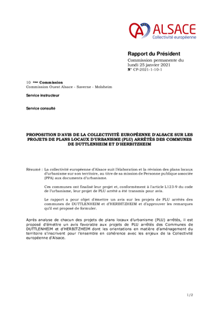 La collectivité européenne d’Alsace suit l’élaboration et la révision des plans locaux d’urbanisme sur son territoire, au titre de sa mission de Personne publique associée (PPA) aux documents d’urbanisme. Ces communes ont finalisé leur projet et, conformément à l'article L123-9 du code de l’urbanisme, leur projet de PLU arrêté a été transmis pour avis. Le rapport a pour objet d'émettre un avis sur les projets de PLU arrêtés des communes de DUTTLENHEIM et d’HERBITZHEIM et d’approuver les remarques qu’il est proposé de formuler.