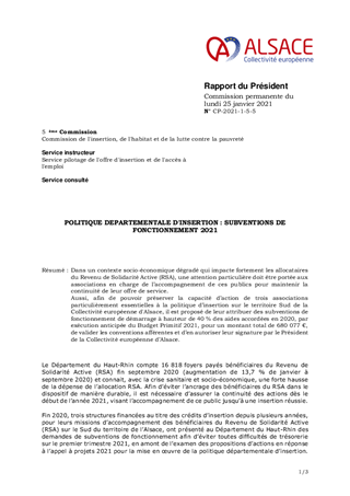 POLITIQUE DEPARTEMENTALE D'INSERTION : SUBVENTIONS DE FONCTIONNEMENT 2021