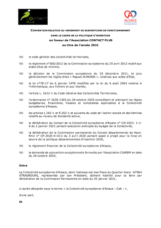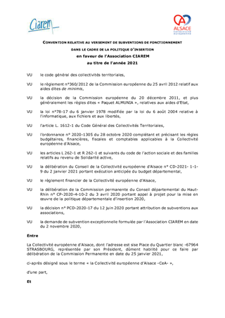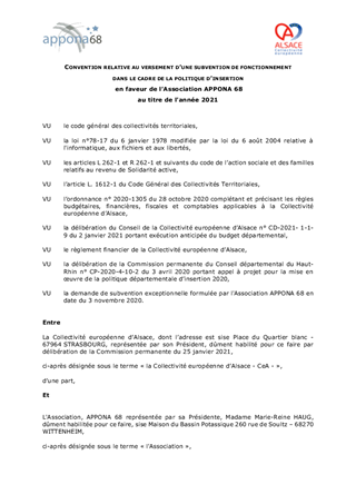Dans un contexte socio-économique dégradé qui impacte fortement les allocataires du Revenu de Solidarité Active (RSA), une attention particulière doit être portée aux associations en charge de l’accompagnement de ces publics pour maintenir la continuité de leur offre de service. Aussi, afin de pouvoir préserver la capacité d’action de trois associations particulièrement essentielles à la politique d’insertion sur le territoire Sud de la Collectivité européenne d'Alsace, il est proposé de leur attribuer des subventions de fonctionnement de démarrage à hauteur de 40 % des aides accordées en 2020, par exécution anticipée du Budget Primitif 2021, pour un montant total de 680 077 €, de valider les conventions afférentes et d’en autoriser leur signature par le Président de la Collectivité européenne d’Alsace.