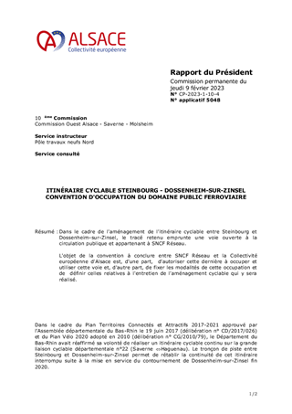 Dans le cadre de l'aménagement de l'itinéraire cyclable entre Steinbourg et Dossenheim-sur-Zinsel, le tracé retenu emprunte une voie ouverte à la circulation publique et appartenant à SNCF Réseau. L'objet de la convention à conclure entre SNCF Réseau et la Collectivité européenne d'Alsace est, d'une part, d'autoriser cette dernière à occuper et utiliser cette voie et, d'autre part, de fixer les modalités de cette occupation et de définir celles relatives à l'entretien de l'aménagement cyclable qui y sera réalisé.