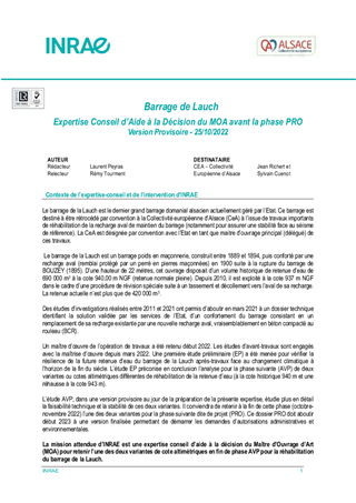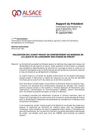 La Collectivité européenne d’Alsace assure la maîtrise d’ouvrage des travaux de réhabilitation du barrage de la Lauch. Cette opération s’inscrit dans le contexte des obligations réglementaires de sécurité de l’ouvrage et dans le cadre de la transition écologique et de la résilience des territoires face aux tensions relatives à l’eau en Alsace et au dérèglement climatique. Le maître d’œuvre a finalisé les études préliminaires et les études techniques d’avant-projet. Il démontre un déficit de ressource en eau de plus de 300 000 m3 d’eau par an avant la fin du siècle sur le territoire concerné. Pour faire face à ce défi majeur et permettre la résilience locale au sujet de l’eau, il conclut à la nécessité d’un confortement rehaussé du barrage. Une mission externe d’appui-conseil a été confiée à l’Institut National de Recherche pour l’Agriculture, l’Alimentation et l’Environnement (INRAE), expert international pour les projets de grands barrages, en aide à la décision. La stratégie proposée est totalement novatrice à l’échelle nationale, dans la mesure où le barrage de la Lauch serait ainsi le premier grand barrage de France dont la réhabilitation intégrerait les paramètres du changement climatique et de la transition écologique. Il est proposé de valider l’avant-projet et de démarrer les études de projet pour assurer la résilience du territoire en matière d'eau face au changement climatique. Cette validation ne vaut ni engagement des travaux ni finalisation du plan de financement, qui ne pourront intervenir qu'après approbation des études de projet. Les études, ainsi que l’avis de l’INRAE, sont annexés au présent rapport.