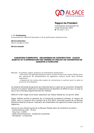 Le présent rapport propose à la Commission permanente : - d’accorder une garantie d’emprunt pour un prêt souscrit par Alsace Habitat pour des opérations de réhabilitations de logements sociaux situés dans diverses communes ; - d’approuver les termes des projets de conventions à conclure pour la mise en œuvre de cette décision.