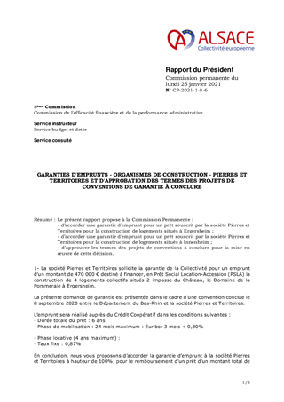 Le présent rapport propose à la Commission Permanente : - d’accorder une garantie d’emprunt pour un prêt souscrit par la société Pierres et Territoires pour la construction de logements situés à Ergersheim ; - d’accorder une garantie d’emprunt pour un prêt souscrit par la société Pierres et Territoires pour la construction de logements situés à Innenheim ; - d’approuver les termes des projets de conventions à conclure pour la mise en œuvre de cette décision.