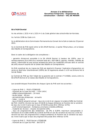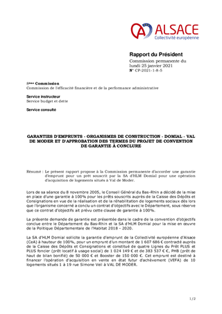 Le présent rapport propose à la Commission permanente d’accorder une garantie d’emprunt pour un prêt souscrit par la SA d’HLM Domial pour une opération d’acquisition de logements situés à Val de Moder.
