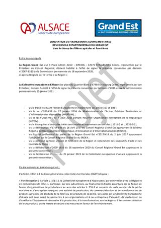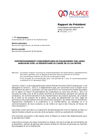 Le présent rapport concerne le conventionnement de financement complémentaire des aides agricoles avec la Région Grand-Est dans le cadre de la loi Notre. Les conventions initiales ont pris fin en décembre 2020. Il est proposé de conventionner pour une période de 3 ans, le conventionnement s'achèvera le 31 décembre 2023.