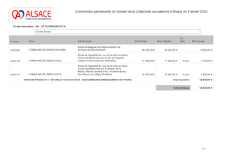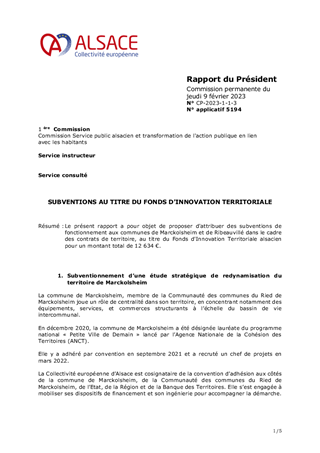 Le présent rapport a pour objet de proposer d'attribuer des subventions de fonctionnement aux communes de Marckolsheim et de Ribeauvillé dans le cadre des contrats de territoire, au titre du Fonds d'Innovation Territoriale alsacien pour un montant total de 12 634 €.