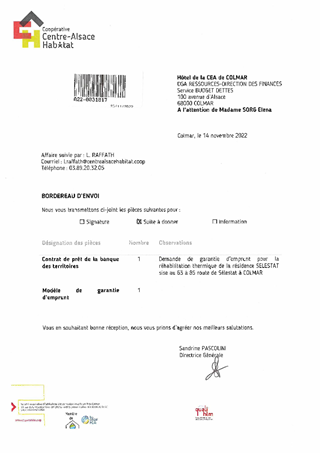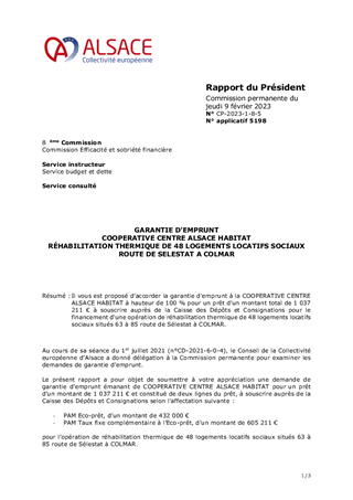 Il vous est proposé d’accorder la garantie d'emprunt à la COOPERATIVE CENTRE ALSACE HABITAT à hauteur de 100 % pour un prêt d’un montant total de 1 037 211 € à souscrire auprès de la Caisse des Dépôts et Consignations pour le financement d'une opération de réhabilitation thermique de 48 logements locatifs sociaux situés 63 à 85 route de Sélestat à COLMAR.
