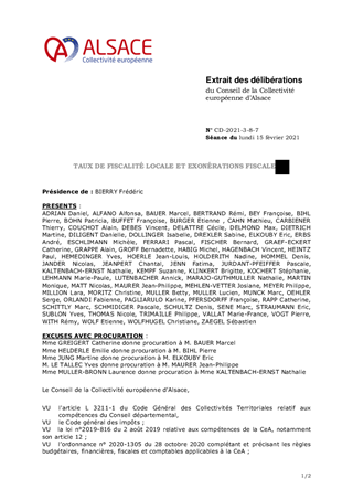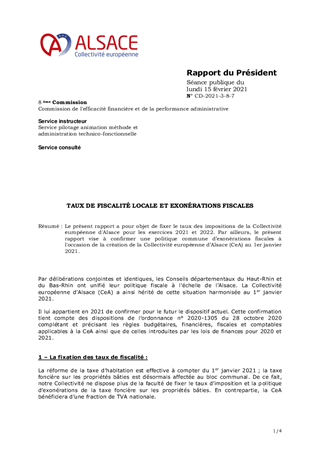 Le présent rapport a pour objet de fixer le taux des impositions de la Collectivité européenne d'Alsace pour les exercices 2021 et 2022. Par ailleurs, le présent rapport vise à confirmer une politique commune d’exonérations fiscales à l'occasion de la création de la Collectivité européenne d’Alsace (CeA) au 1er janvier 2021.
