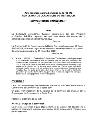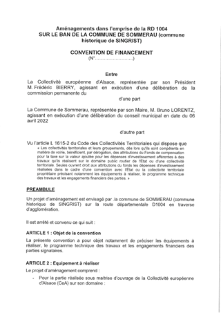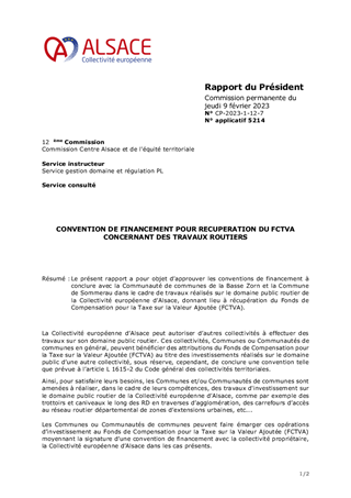 Le présent rapport a pour objet d’approuver les conventions de financement à conclure avec la Communauté de communes de la Basse Zorn et la Commune de Sommerau dans le cadre de travaux réalisés sur le domaine public routier de la Collectivité européenne d’Alsace, donnant lieu à récupération du Fonds de Compensation pour la Taxe sur la Valeur Ajoutée (FCTVA).