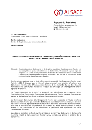 Conformément au Code rural et de la pêche maritime, l’aménagement foncier est une compétence pleine et entière de la Collectivité. Ce rapport a pour objet de proposer à la Commission permanente de décider de l’institution d'une Commission Communale d’Aménagement Foncier à BISSERT en vue de la réalisation d’une étude préalable d’aménagement foncier.