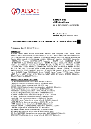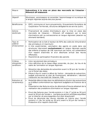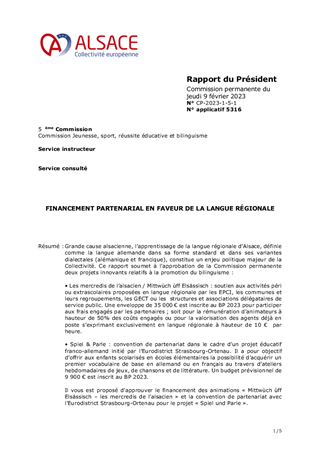Grande cause alsacienne, l’apprentissage de la langue régionale d’Alsace, définie comme la langue allemande dans sa forme standard et dans ses variantes dialectales (alémanique et francique), constitue un enjeu politique majeur de la Collectivité. Ce rapport soumet à l’approbation de la Commission permanente deux projets innovants relatifs à la promotion du bilinguisme : • Les mercredis de l’alsacien / Mittwùch ùff Elsässisch : soutien aux activités péri ou extrascolaires proposées en langue régionale par les EPCI, les communes et leurs regroupements, les GECT ou les structures et associations délégataires de service public. Une enveloppe de 35 000 € est inscrite au BP 2023 pour participer aux frais engagés par les partenaires ; soit pour la rémunération d’animateurs à hauteur de 50% des coûts engagés ou pour la valorisation des agents déjà en poste s’exprimant exclusivement en langue régionale à hauteur de 10 € par heure. • Spiel & Parle : convention de partenariat dans le cadre d’un projet éducatif franco-allemand initié par l’Eurodistrict Strasbourg-Ortenau. Il a pour objectif d’offrir aux enfants scolarisés en écoles élémentaires la possibilité d’acquérir un premier vocabulaire de base en allemand ou en français au travers d’ateliers hebdomadaires de jeux, de chansons et de littérature. Un budget prévisionnel de 9 900 € est inscrit au BP 2023. Il vous est proposé d’approuver le financement des animations « Mittwùch ùff Elsässisch – les mercredis de l’alsacien » et la convention de partenariat avec l’Eurodistrict Strasbourg-Ortenau pour le projet « Spiel und Parle ».