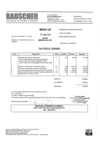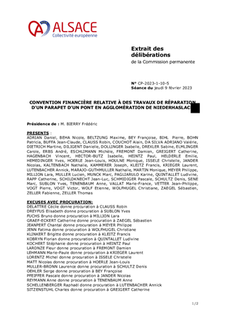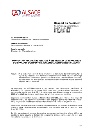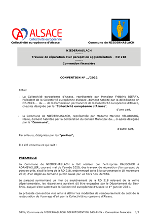 CONVENTION FINANCIÈRE RELATIVE À DES TRAVAUX DE RÉPARATION D'UN PARAPET D'UN PONT EN AGGLOMÉRATION DE NIEDERHASLACH